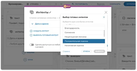 Интенты дают чат-боту способность понимать смысл. Они определяют проблему клиента и реагируют в соответствии с логикой сценария. Чат-бот на Aimylogic уже обучен узнавать приветствие, прощание, согласие и отказ, благодарность и даже ругательства. Просто вставьте нужный блок в сценарий.