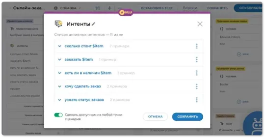 Machine Learning алгоритмы позволяют постоянно улучшать бота, обучая его на примерах реальных фраз. Добавляйте собственные интенты — примеры фраз, которые чат-бот должен отнести к той или иной теме вопроса. Остальное сделает машинное обучение!